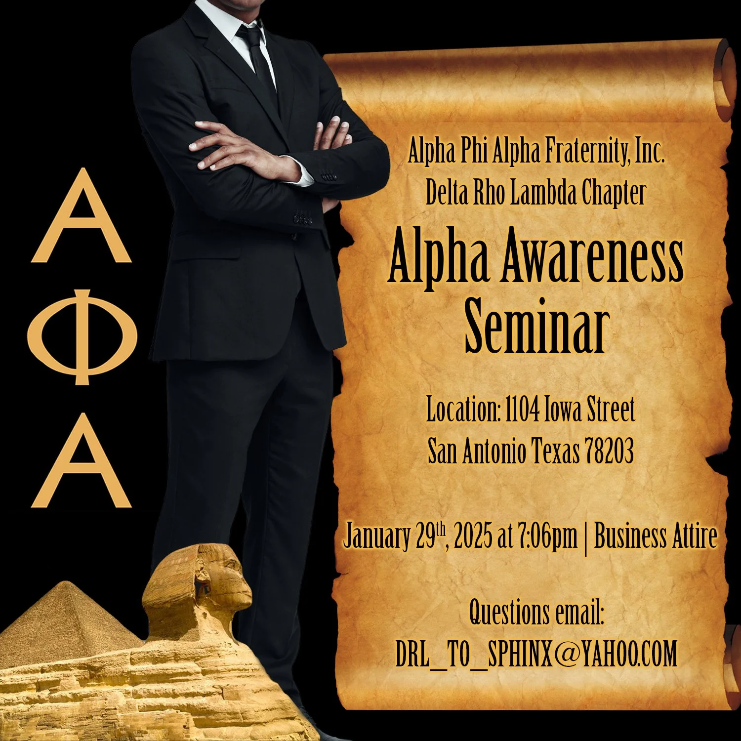The Brothers of the Delta Rho Lambda Chapter (Alpha Phi Alpha Fraternity, Inc.) will host an Alpha Awareness Seminar for men seeking to become members of Alpha Phi Alpha Fraternity,...
